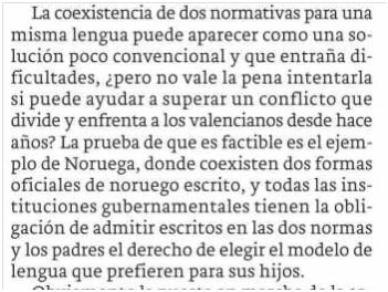 "Una solució que en atres països, com en Noruega, ha propiciat una coexistència pacífica entre visions idiomàtiques discrepants, i han donat lloc a un marc de convivència que permetrà assegurar a la societat en conjunt una visió ajustada del conflicte, no mediatisada pels interessos privats de determinades formacions polítiques i lobbies de pressió.".