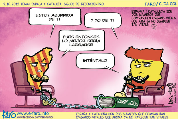 Ara el govern catala ha anat mes llunt. Ara demanen l'independencia. Han llançat el "joc fora" ─per a qui no conega el joc del truc, el "joc fora" implica jugar-se la partida a una carta. El proces va rebotant pels quatre jugadors, el primer "truca", u dels adversaris, si te bona ma o se marca un farol, "retruca", el següent fa lo propi i llança el "quatre val" i l'ultim en parlar te opcio a desafiar en el "joc fora". Si accepten el "joc fora" qui guanya la ma guanya la partida. Molts es retiren de l'aposta encara que tinguen bones cartes en previssio de que l'atre puga tindre-les millors─.