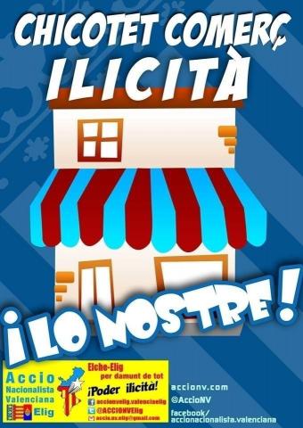 Accio Nacionalista Valenciana ANV Accio NV Elig-Elche RECOLZA al sector dels chicotets comerciants locals ilicitans (recolzant les seues necessitats, aspiracions, reivindicacions), i demana que ademes de concedir ajudes les administracions i els bancs a la creacio de nous comerços, a l' autoempleament, als mamprenedors...que tambe se concedixquen ajudes als comerços ya existents i historics per a poder garantir la seua supervivencia i evitar el tancament.