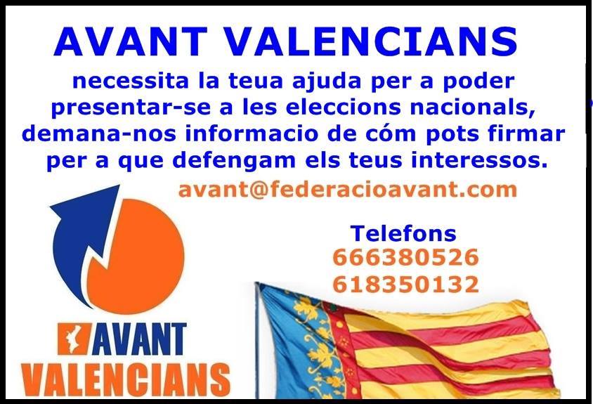 La Coalicio AVANT de la que Accio Nacionalista Valenciana forma part aspira a poder representar a tots i cadascu dels ciutadans del territori valencià. Treballem en constancia i ilusio per a conseguir que aixina siga, volem que tots els valencians i valencianistes tinguen veu i volem arreplegar les vostres propostes i necessitats particulars que sabem son diferents en cada localitat. Entre tots poderm fer-ho.