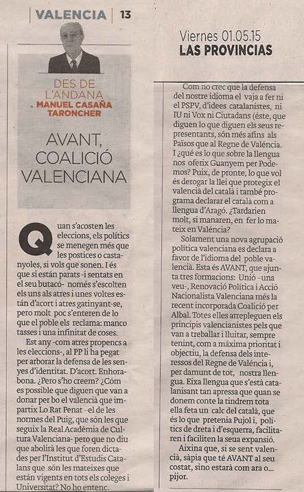 Reproduïm l'articul publicat en Las Provincias el 01-05-15 de Manuel Casaña Taroncher: