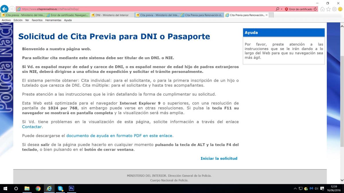 Accedim ad una pagina que indica pertanyer al Ministeri de l'Interior, Direccio General de la Policia, Cos Nacional de Policia... L'avis d'erro de certificat es manté visible. No obstant, baix la garantia de la procedencia de la uep, continuem cap a avant i punchem en "iniciar la solicitut".