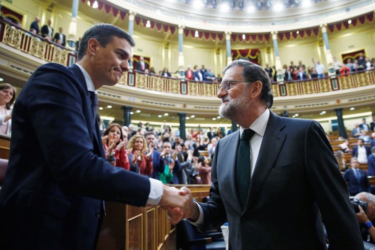 Alegant la corrupcio i la no assuncio de responsabilitats politiques per part del PP en el cas Gürtel, el PSOE, presentà una mocio de censura contra el president Rajoy. Com que els vots propis i els de Ciudadanos no n’eren prou, la resposabilitat ultima recaïa sobre el PNV que ya li havia aprovat els presuposts d’enguany, pero hauria tengut molt mala venda publica mantindre a Rajoy en els seus cinc vots. El PNV amenaçà, o se’n va o votarém a favor. El capità del barco ha preferit immolar-se i la majoria del Congres, que fa uns anys li donà la seua confiança, ara li l’ha retirada: 180 en contra, 169 a favor i 1 abstencio.