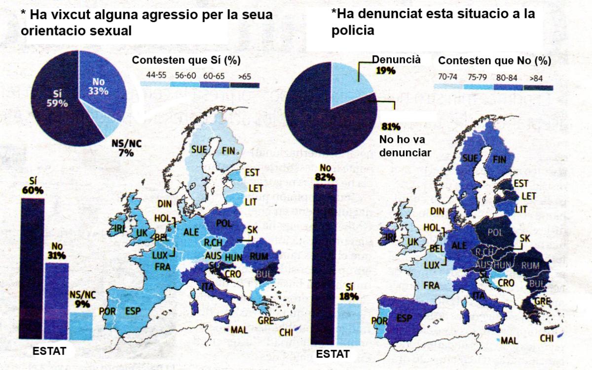 Segons una macroencuesta realisada en l'Unio Europea sobre discriminacio i delits motivats per prejuïns contra gais, lesbianes i transexuals, presentat en 2013, un 46 % dels enquestats a nivell estatal digue haver segut atacat o amenaçat en violencia en l'ultim any —un punt per damunt de la mija de l'estudi— i nomes el 18 % ho havia denunciat —un punt menys que la mija—.