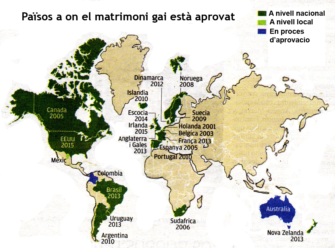 De manera sorpresiva, fon el primer païs que aprovà el matrimoni del mateix sexe en plena equiparacio de drets en el restant de matrimonis. En tots estos anys han segut numerosos els països en els que s'ha aprovat el matrimoni gay a nivell mundial. En Europa: Belgica, Portugal, Dinamarca, Suecia, Islandia, Noruega i França, entre uns atres. L'ultim gran pas tingue lloc el passat divendres 26 de juny de 2015, quan el Tribunal Suprem d'Estats Units prengue una decisio historica, al declarar inconstitucionals totes les lleis estatals que prohibixen el matrimoni homosexual i afirma que tots els estats deuen de reconeixer el dret a l'unio entre persones del mateix sexe. Com digue el seu president es un gran pas per a la democracia. Est ultim fet coincidix en l'aniversari de la celebracio del Dia de l'Orgull Gay.