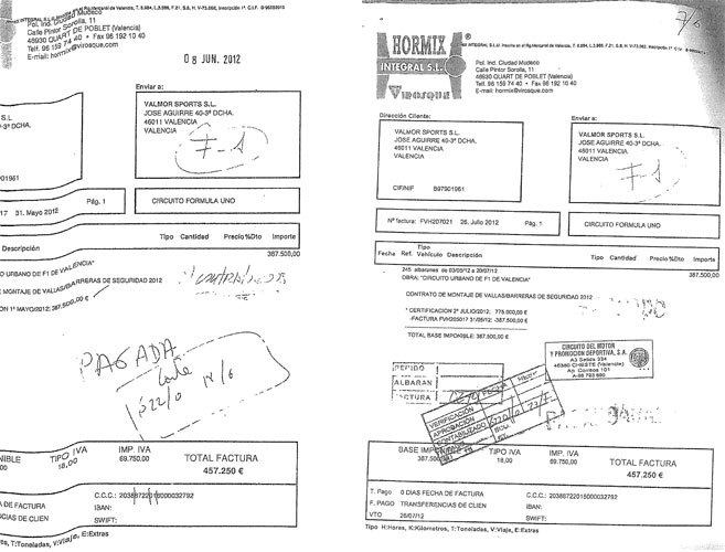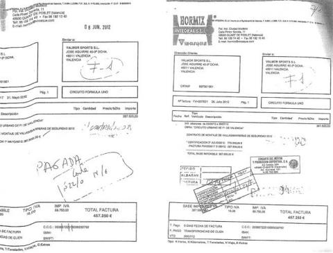 Una de les factures se presentà el 31 de maig de 2012 i pujà a 457.250 euros pel montage de tanques i barreres de seguritat. La segona porta data de 26 de juliol de 2012 i l'import i el concepte es repetix. Fonts de Circuit del Motor s'apresuraren a explicar ahir que les factures se presenten per treballs realisats en 2012 pese a que en la factura apareix escrit a ma l'any 2008. Els pagaments, puix, son conseqüencia del contracte al que arribà Valmor eixe any i que heretà la Generalitat en rescatar economicament l'event. Per tant, estes contractacions no responen a un proces public i transparent -Valmor era una societat privada- com exigix la Llei de contractes publics per ad eixes quanties. Pero hi ha mes.