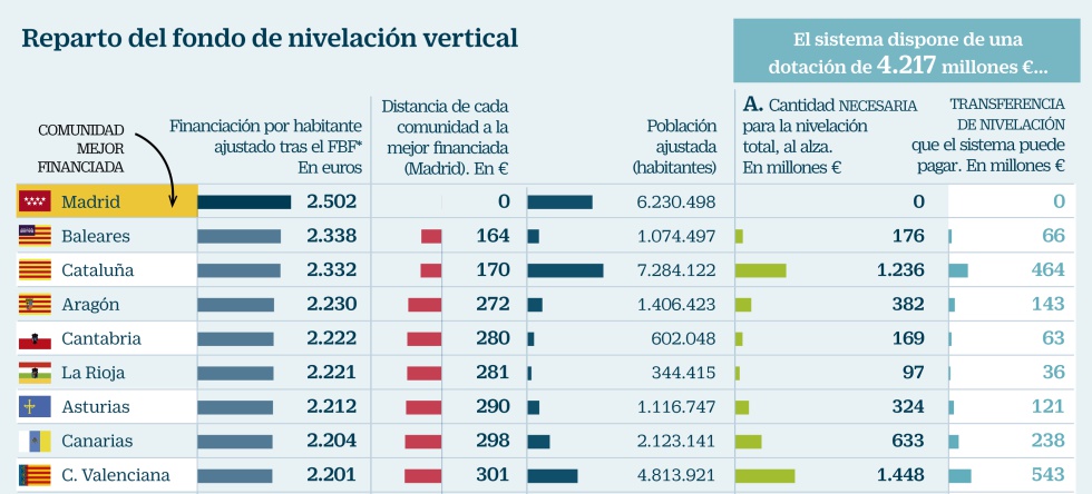El desficaci de la perdua del juï de realitat afectarà directament a un sistema inestable ab initio pels privilegis de les comunitats forals. O comencem des de zero o aço no te solucio, sera un conflicte permanent –per falta de consciencia nacional que impedix als nacionalistes valencians fer politica–. Cafe per a tots i caviar per a uns quants no pot ser. La "contingencia" catalana encara estirarà mes el chiclet i com que els recursos son llimitats, no podem esperar millores substancials per als valencians. Inclus la proposta de De la Fuente sería incompleta com es podra observar en el següent grafic, perque no es compensable la cantitat necessaria total –1.448 millons– front a la transferencia de nivellacio real –543 millons–. El nou model necessitaria mes de 11.200 millons adicionals per a equilibrar la balança fiscal, ara nomenat sistema de contes publics territorialisats. Resultaria absurt que plantejaren un procediment inestable de nou, en honor a la veritat, de la Fuente propon que siguen les comunitat autonomes les que recapten mes, utilisant bona part dels imposts autonomics. Per eixemple, Madrit realisa dumping fiscal quan reduix els imposts i facilita a les empreses que es situen alli; no grava patrimoni perque el bonifica al 100% i elimina successions i donacions al 99% en la mateixa tecnica. Considera que les autonomies haurien d'intervindre en la gestio del tipo o trams de l'IVA, es dir, que siguen elles les que donen la cara davant de l'electorat; si volen mes, puix que pugen els imposts, aixina el Govern espanyol vol llevar-se el mort de damunt. De fet, la nova proposta es inviable a dia de hui, i si millora el deficit, almenys teoricament, pero no acaba en l'infrafinançacio, continuariem en el mateix bucle. Poden observar-ho: