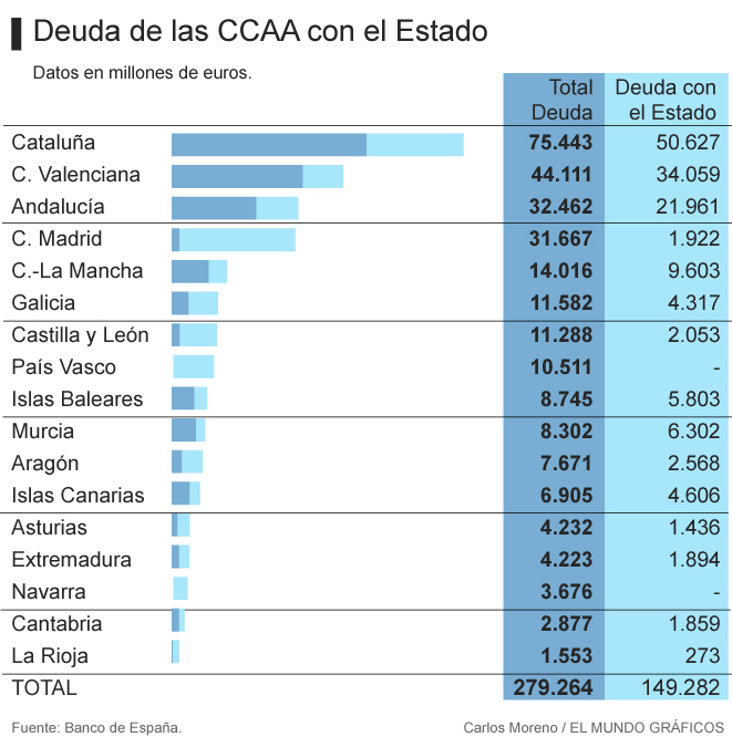El deute que podria emetre la Generalitat Valenciana, per a obtindre recursos, te categoria de "fem" -catalogat aixina per les agencies de rating i gracies a la gestio del PP-, com el catala, per lo tant, es el tesor espanyol el que demana els prestams, nos cobra interessos i se lucra (a través de dos vehiculs: el pagament a proveïdors i el fondo de liquidea autonomica, conegut per les sigles FLA) a la vegada que nos infrafinança. Es un circul vicios, com no tens els suficients diners has de demanar-ne mes, aço genera mes interessos, en lo que la situacio es torna perversa, una sifra impagable que nomes fa que creixer i te somet al principal prestamiste: l'estat, li devem al voltant del 77 % del nostre deute. U de cada quatre euros de la GVA aniran a pagar amortisacions i interessos. El mateix cas te Catalunya, en el major deute d'Espanya i son les raons economiques les que fan que l'independencia siga stricto sensu impossible.