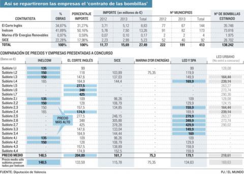 Inelcom logrà en 2012 i 2013 els contractes de 173 municipis -el 41'89% de les obres- i, a pesar de ser el mes car en comparacio en les mateixes ofertes, s'adjudicà el 50'16% dels diners, un percentage que supon 13'263 millons d'euros, segons senyes oficials de la Diputacio.