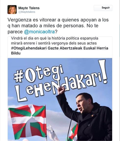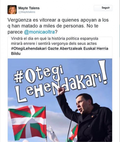 Per eixe motiu a lo manco resulta curios que tant Chimo Puig, com Monica Oltra hagen rectificat les seues declaracions inicials. El primer, en acabant de parlar a favor de la candidatura d'Otegi, va fer un articul contra el terrorisme i a favor de les victimes... -molt coherent- i la segona ordenà la supressio del comentari de les pagines de Facebook, i llançà declaracions de la seua desvinculacio en la violencia i les actituts d'Otegi.