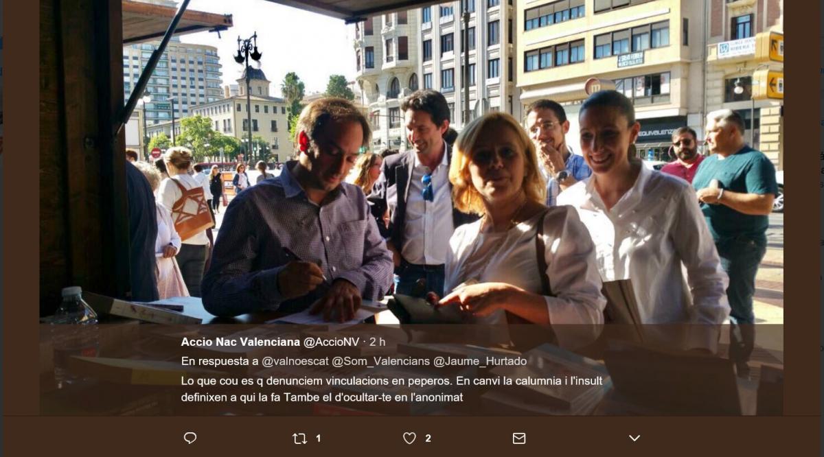 Curiosament el personage en qüestio ataca a Accio Nacionalista Valenciana i en especial fixacio al seu president, es dir a mi, per unes publicacions en Twitter que feyen referencia a l'estreta relacio entre Som Valencians i membres del PP, en concret en Carmen Contelles, qui es passà per la fira d'entitats valencianistes parant a fer-se la foto i que li firmara un llibre Jaime Vicente Hurtado i intercanviaren mensages de "plaer" vid.