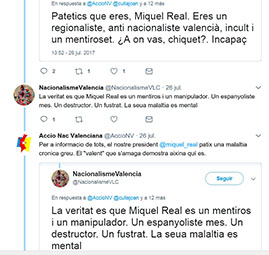 La llibertat d'expressio te un llimit. Els atacs personals, se n'ixen de les practiques llegitimes del dret a la llibertat d'expressio. Clavar-se en la meua malaltia com ha fet la persona que en Twitter s'amaga covardement baix el malnom de NacionalismeValencia es una mostra inequivoca de la seua manca absoluta d'arguments.