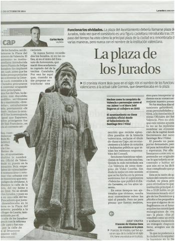Ya mai tornaren a ser recordats els Jurats, ni en els carrers, ni en el text de l'Estatut d'Autonomia, que naixque descaradament copiat del de la veïna Catalunya. Per aço, quan se me propon estructurar una seccio que revisite episodis passats de l'historia valenciana, reclame el titul de "Jurat en Cap", en reconeiximent a la llabor de notaris i fedataris publics que tenien els maxims responsables del Consell.