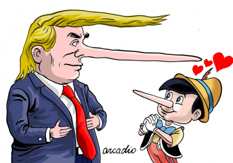 Donald Trump I va ser un fulano de Sueca que entrà en el llibre de recorts Guinness per contar mes boles que ningu, en el seu primer mandat: “En total, desde el 20 de enero de 2017 (cuando tomó posesión) y el 12 de enero de del 2021 (el último día del que tiene registro el 'Washington Post'), el expresidente de los Estados Unidos ha contado más de 30.000 mentiras.” (El Objetivo, La sexta, 17-1-2021). En este curriculum continuar votant-lo es simplement irracional i com la conducta de vot ho es, tens una identificacio emocional o ideologica en Pinocho, una convergencia de desti en lo universal. Si votes a un lladre, ¿tu qué eres?