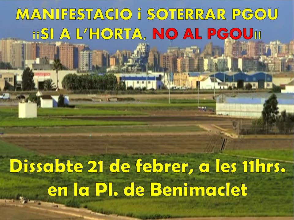 AccioNV junt als veïns de Benimaclet, en defensa de L'Horta i contra el PGOU. El proxim dissabte, 21 de febrer, a les 11hrs. plaça de Benimaclet, participarém en la manifestacio i soterrar del PGOU que preten ferir de mort a L'Horta de Valencia, patrimoni historic-cultural d'un valor immens que hem de protegir entre tots els valencians."