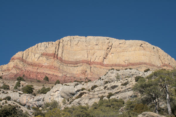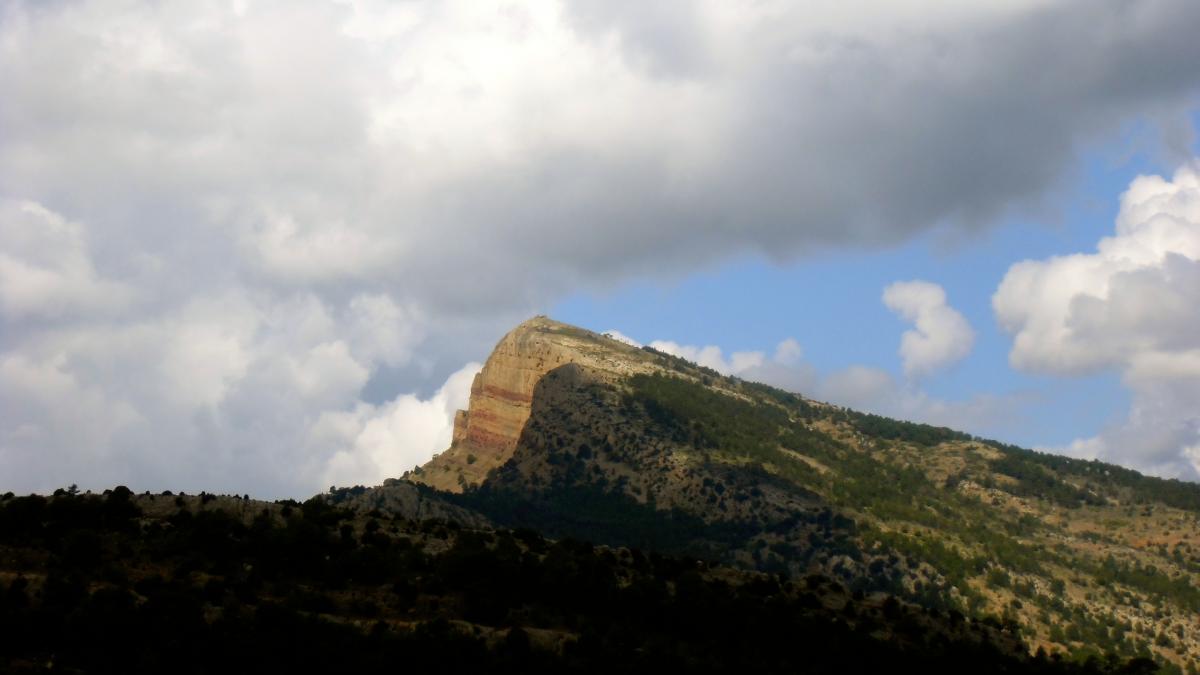 en hivern i resec en estiu, la seua descantellada capdamunt (tres pics, com una corona) gavinetejada lateralment per un deposit de terra roja emparetat entre les seues capes de roca calcarea clara. Vista des de determinats anguls, la montanya casi pareixia un falco alçant el vol” (Jason Webster “La montanya sagrada”)
