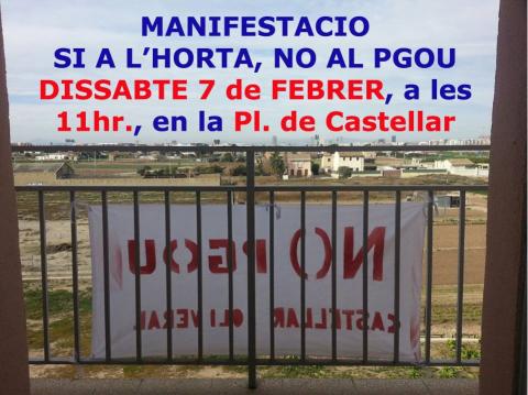 Accio Nacionalista Valenciana s’adherix a la MANIFESTACIO organisada pels veïns de Castellar-L’Oliveral, per al proxim dissabte 7 de febrer, a les 11hrs, que començarà en la Plaça de Castellar, per a continuar lluitant en l’objectiu de paralisar el vergonyos PGOU que l’Ajuntament de Valencia ha presentat, i en el qual vol tornar a atentar contra el Patrimoni de TOTS els valencians: L’Horta de Valencia. NO al PGOU.