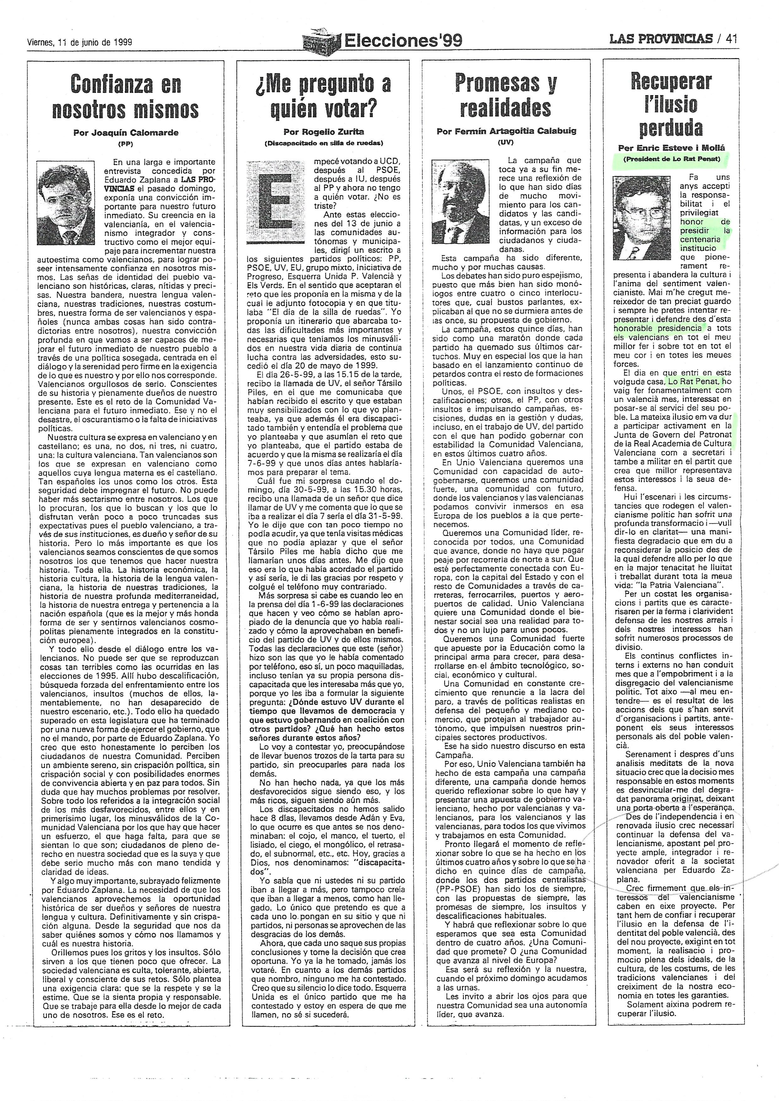 Si no rebem mes soport, sera una opcio llegitima, hem de ser realistes, tampoc podem anar contra la tendencia general dels adossats mediocres i llepaciris. La valentia i el realisme no son antonims. El cost es immens i mes be penos, poc gratificant. Ha segut una batalla interna constant, innegable. ¿En quína mida la coherencia i la consistencia que alguns aportem servix a uns atres per a vendre el nostre moviment ad maiorem gloriam del PP? Quan recorde l'esforç dels nostres antepassats en el valencianisme sent vergonya i avorriment. S'aprofiten de l'ilusio, les investigacions, de les emocions compartides, de la participacio de tanta gent. Per eixemple ¿qué diria Antonio Ubieto si alçara el cap i vera al seu discipul Ramonet en la AVLl?