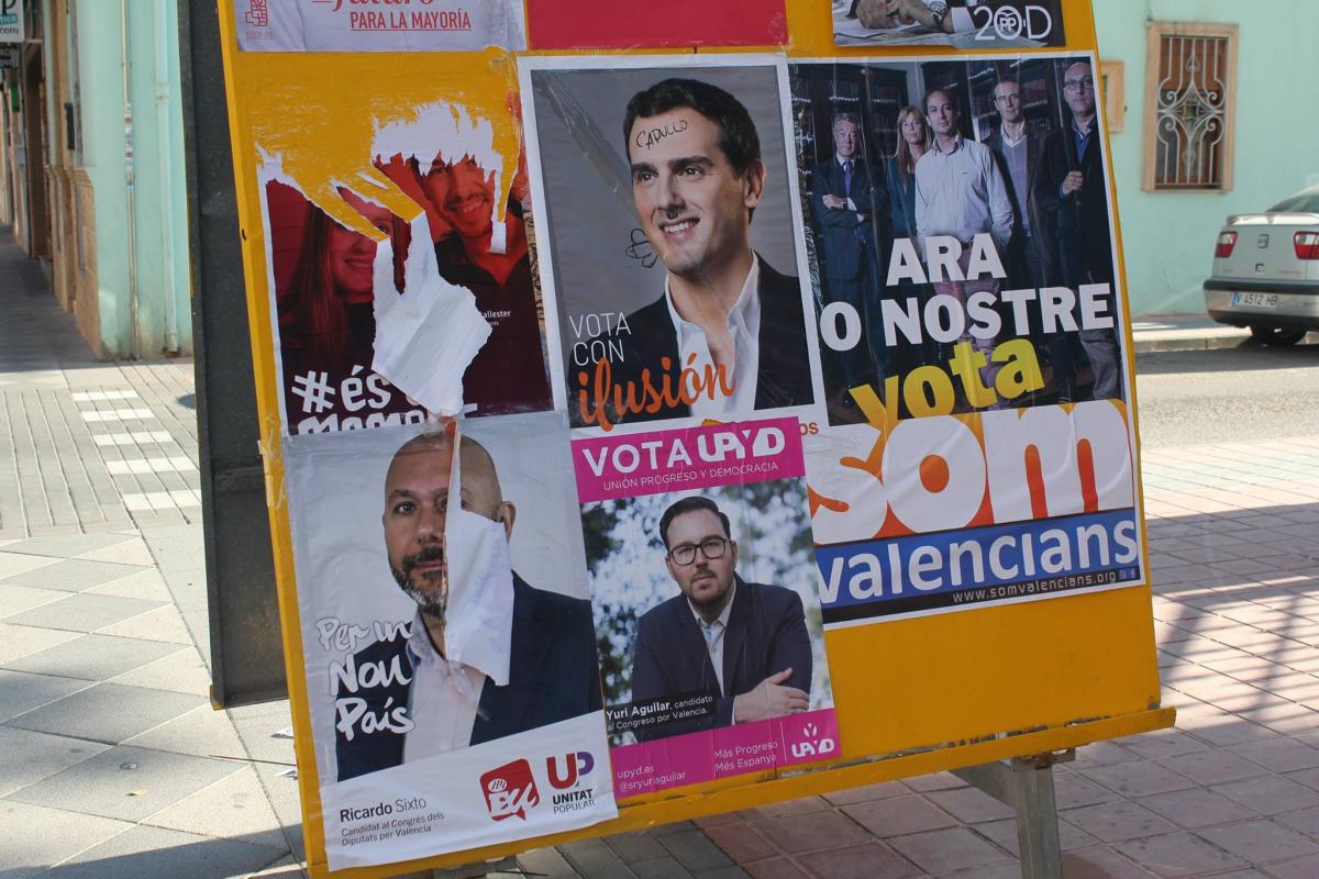 Per tant en acabant no pots queixar-te si uns atres fan us llegitim del seu espai electoral que tu estas invadint. I per a finalisar, quint, no pots acusar a cap de tapar els teus "llançols" que no cartells, quan tu t'estas dedicant de tapar a tot lo que pilles per davant, com puga ser als companyers de la coalicio "En Positiu" o al partit de les feministes... per posar un eixemple. Es llogic, quan acodixes en un cartell que se menja tot l'espai reservat per a "uns atres" o tapes a tots els demes o ells te tapen a tu quan ocupen l'espai que per llei els correspon. (Els cartells de Ciutadans tambe son mes grans de lo que els correspon, dels de la foto quí mes s'ajustaria son los de UPYD).