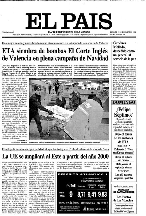 16 de decembre de 1995.- L'esclafit d'una bomba colocada per un comando d'ETA en l'escusat de la cafeteria d'El Corte Inglés de Valencia causà la mort de Josefina Corresa Huerta.