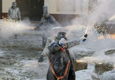 Ibi, municipi de les comarques del sur, ha celebrat este dumenge una de les jornades mes peculiars de les seues festes d'hivern en la que un grup de persones, "Els Enfarinats", ha pres el "poder civil" de manera ficticia i per un dia a colp de "escaramusses" i "batalles" d'ou, farina i petars voladors.