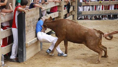 Pujats a la reixa buscant fugir de l'alcanç del bou